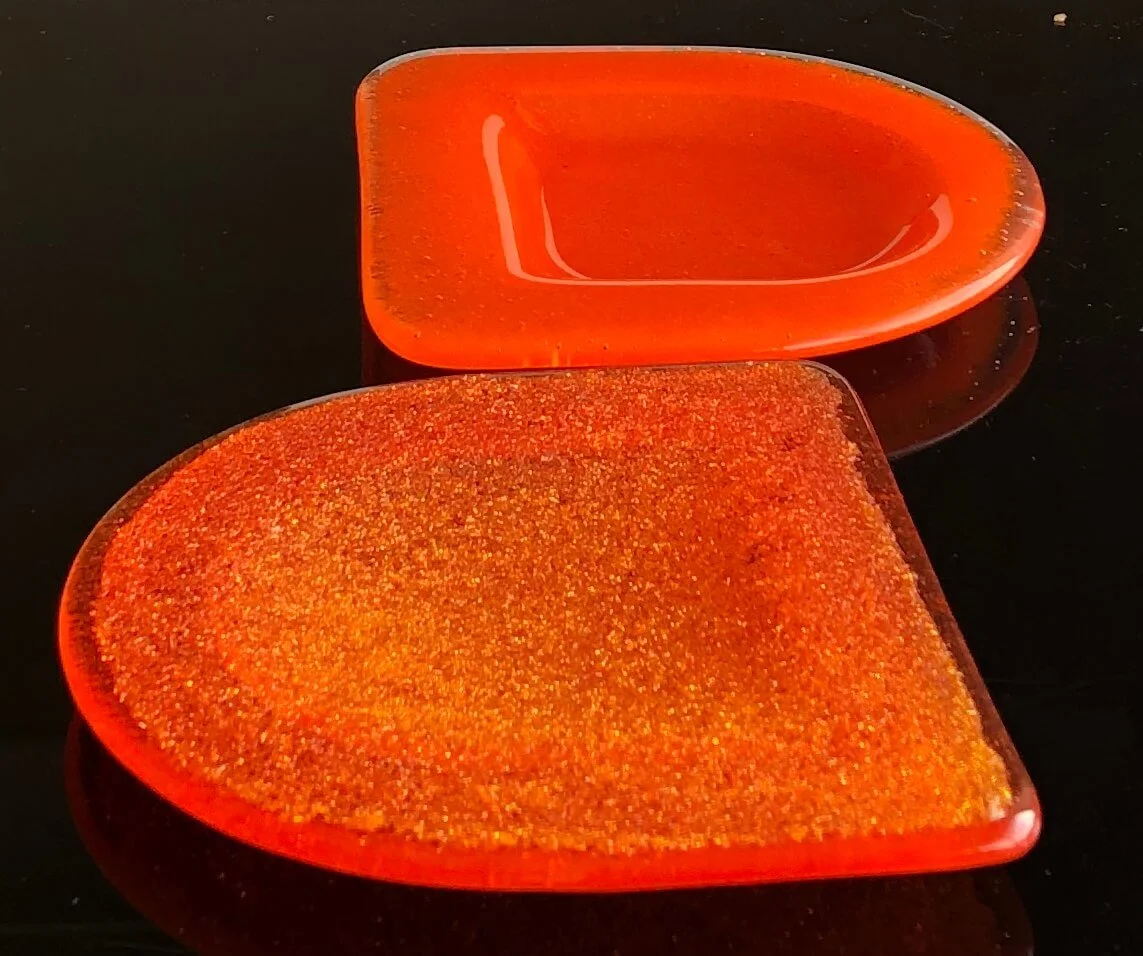The Barbicana Platter’s shape originated directly from seeing the open sided shapes of the Barbican building on Silk Street that are passed so often when walking from Liverpool Street Station to the centre. The shape is also a nod to the barrel vaulted roof. Having seen the multitude of experimental concrete panels hidden away behind the main stage viewed on a tour of the Barbican, she experimented with many layerings of kiln formed glass at various temperatures and frit concentrations to achieve, eventually, a rough and a smooth platter.